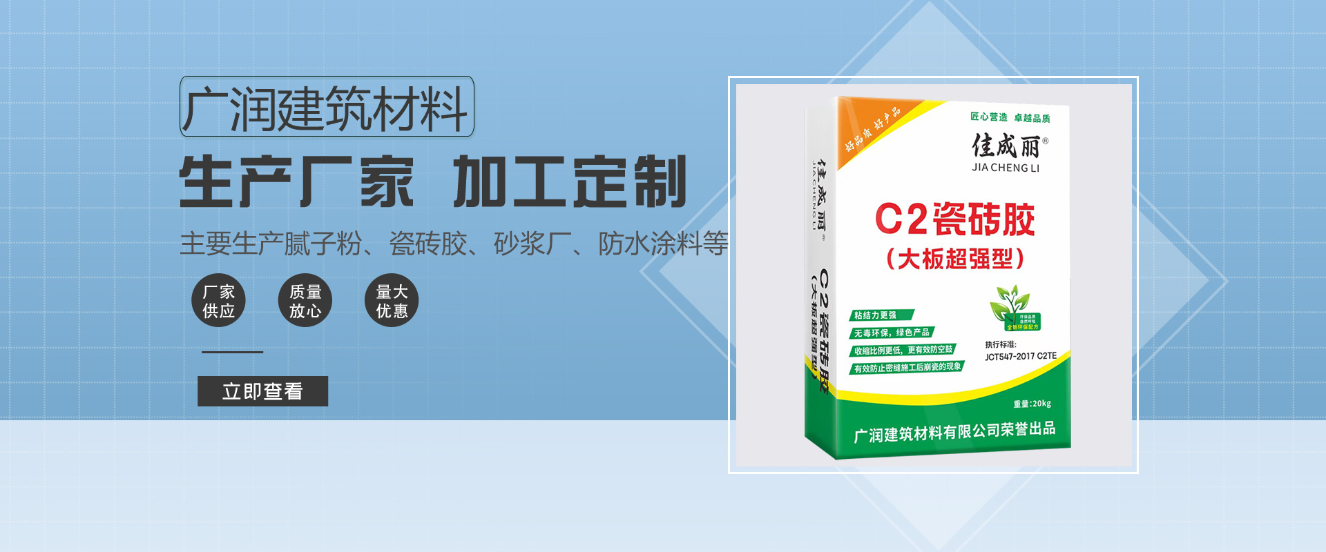 廣西廣潤建筑材料有限公司一直致力于高品質的新型膩子的研制,已取得了多項科研成果。開發出一系列廣受市場歡迎的涂料產品,集研發、生產、銷售于一體的建筑材料制造企業。廣西廣潤建筑材料有限公司會聚了具豐富經驗的專業技術人才及高素質的管理隊伍。主要從事生產,水性環保鋼化膩子粉,外墻彈性、柔性、抗裂型膩子粉、內墻防水膩子粉等中高檔建材產品。廣西廣潤建筑材料有限公司開業至今,本著“求實、進取、信譽為本、客戶至上”的宗旨,積極開拓業務,取得了優異成績,……